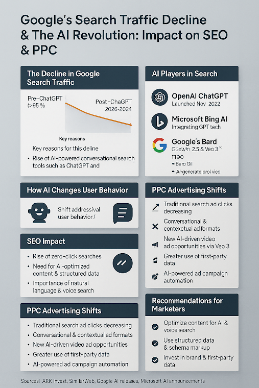 Final Thoughts: The Paradigm ShiftGoogle’s decline in search share isn’t just a dip — it’s a tectonic shift. The future of search is no longer about links, but about intelligent conversations, contextual answers, and integrated multimedia experiences. For businesses, marketers, and content creators, adapting to this new AI-driven search ecosystem is critical — from SEO to PPC, from content creation to customer engagement. Google’s Gemini 2.5 and Veo 3 demonstrate the company’s commitment to innovation, but ChatGPT, Bing AI, and other AI-first players have permanently altered the search landscape. The question isn’t whether Google will remain relevant — it will — but how we adapt to a future where AI defines how we find and interact with information. |